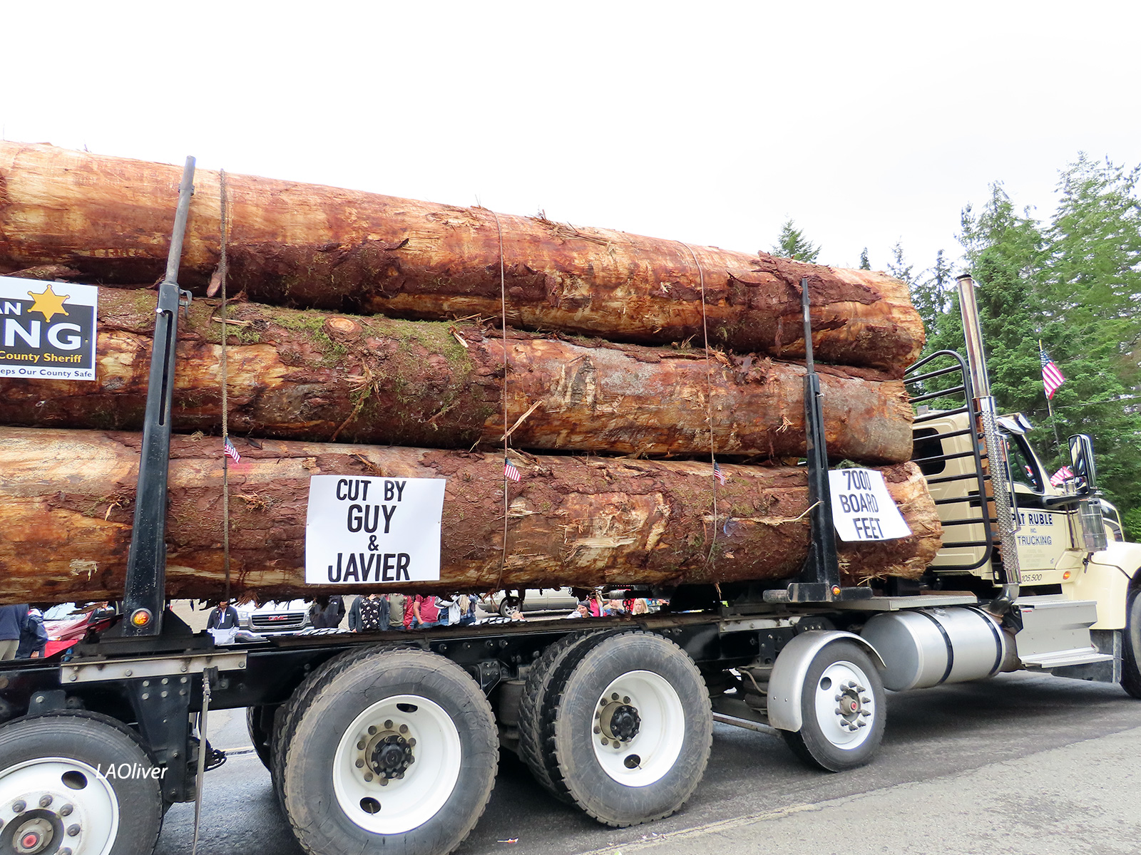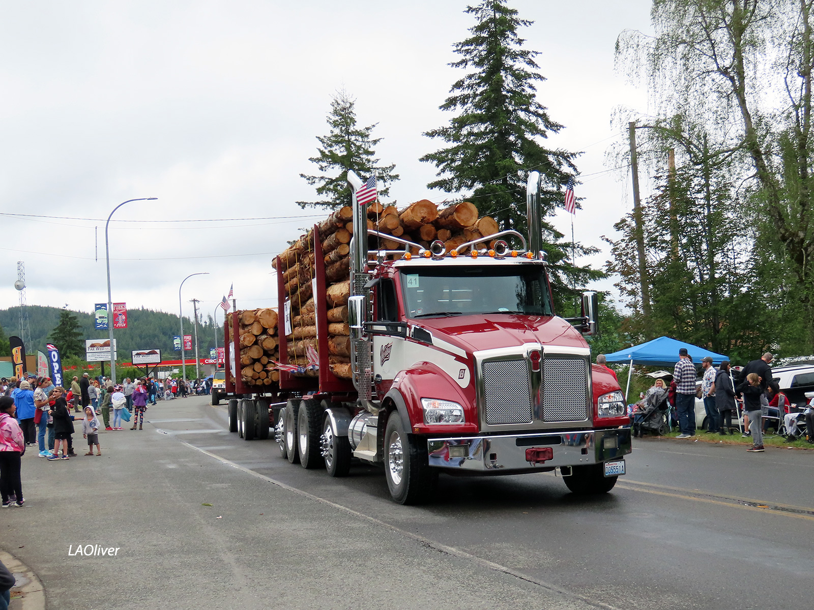 Logging trucks bring up the end of the parade.