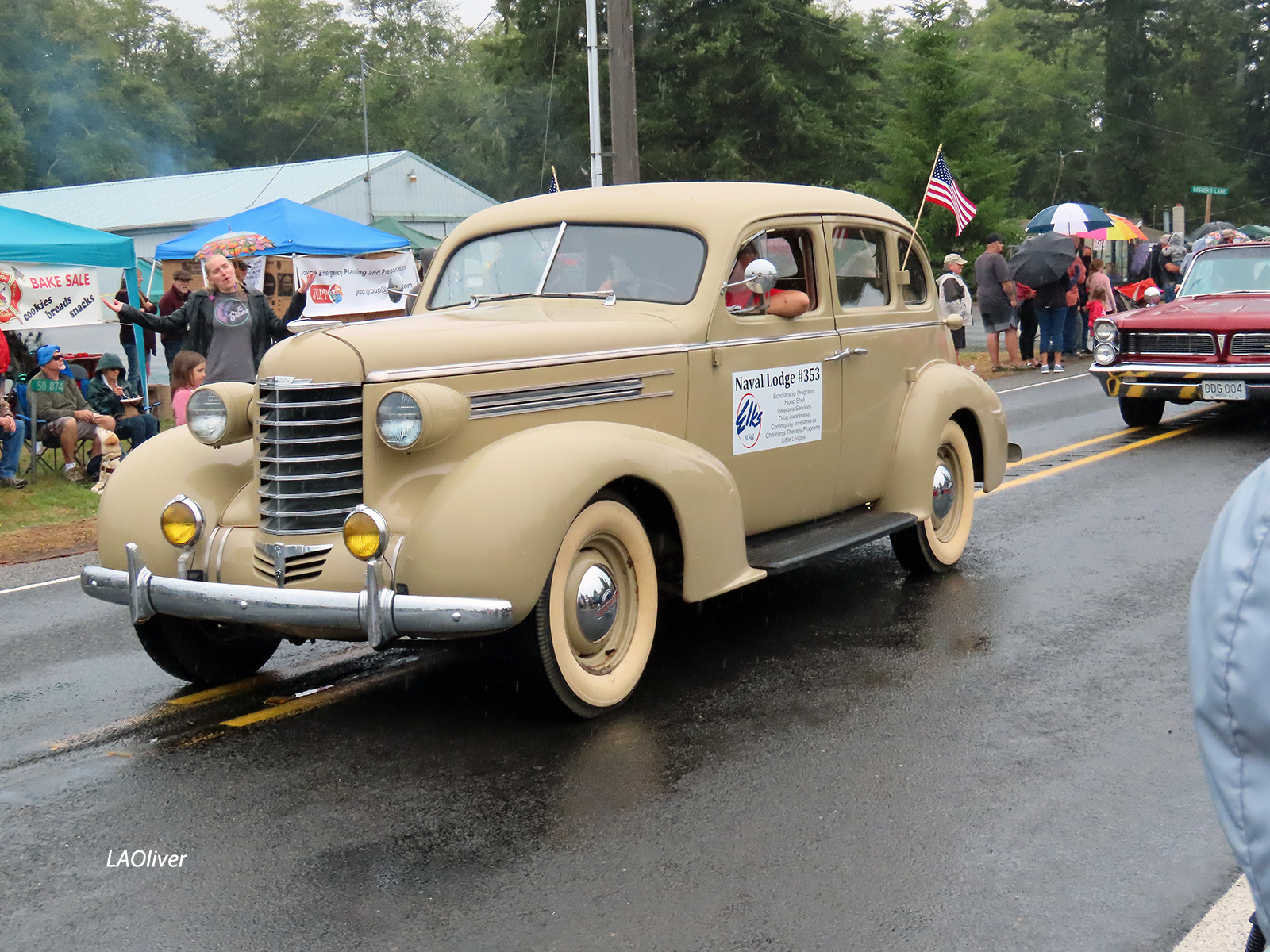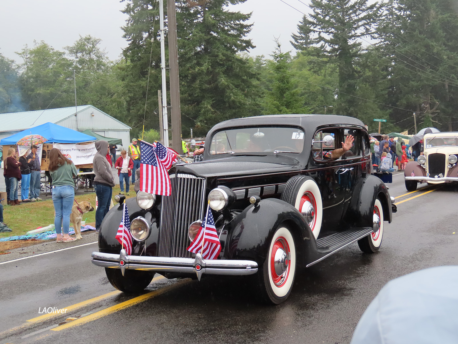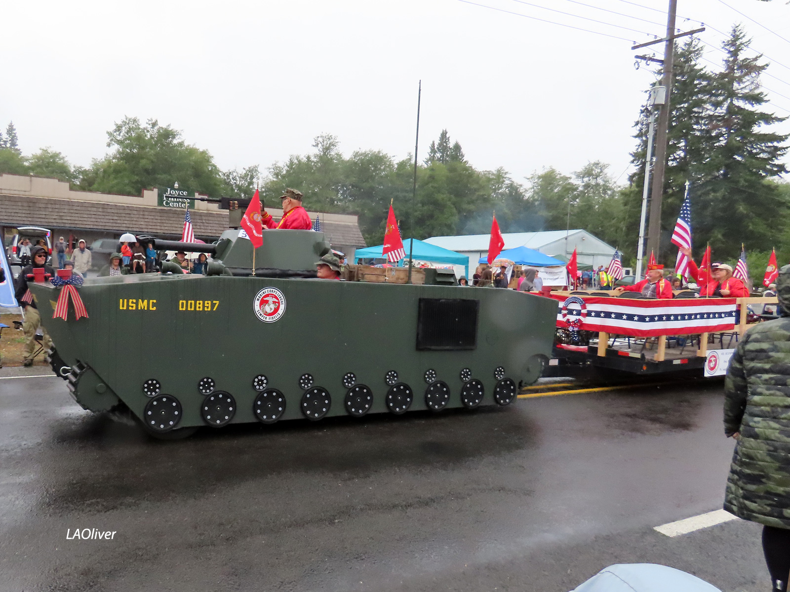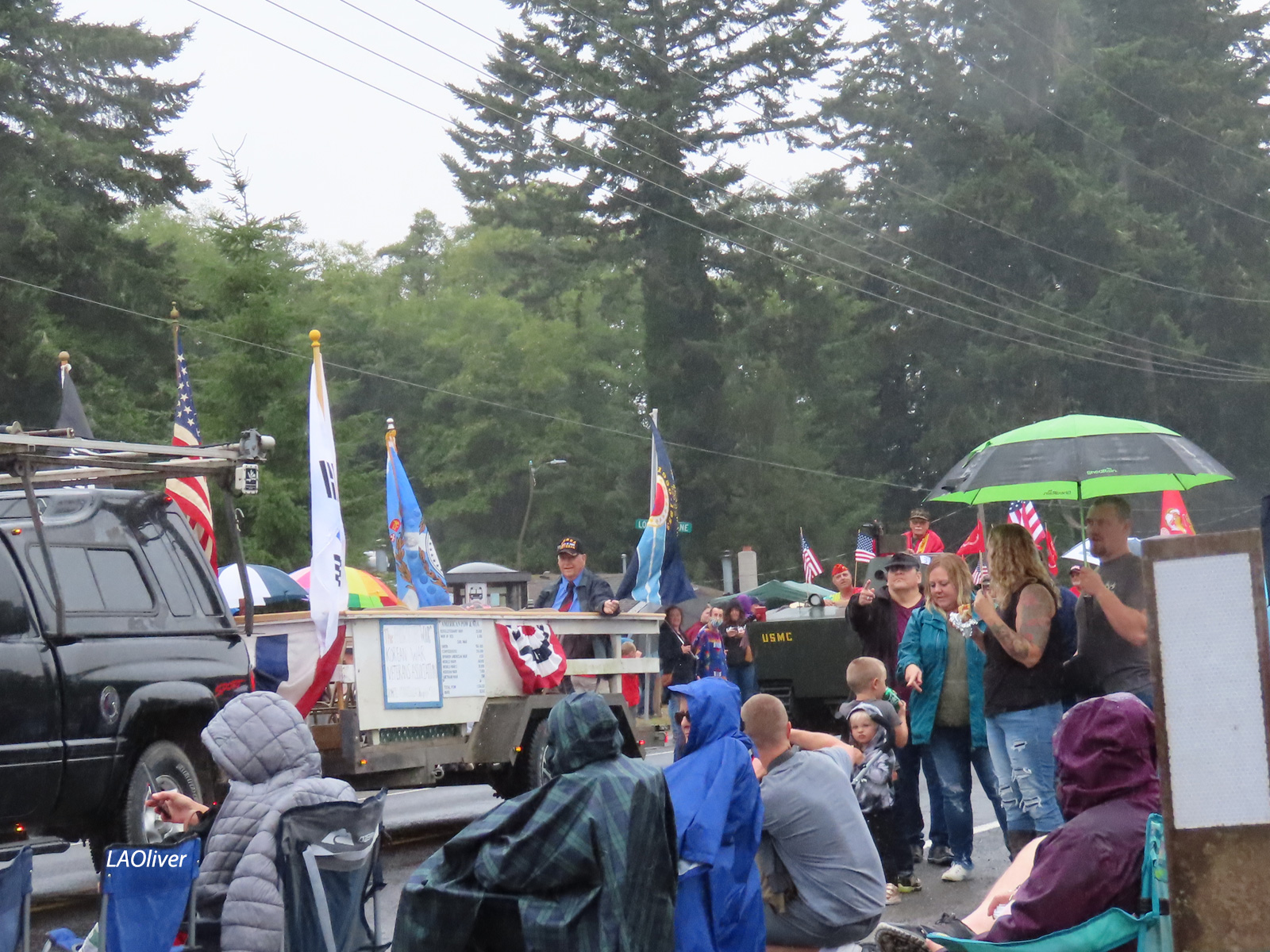 The color guard and military floats drove by. When they stopped and the National Anthem was played, despite the rain, hats were removed, hands placed over hearts, and most of us sang softly.
