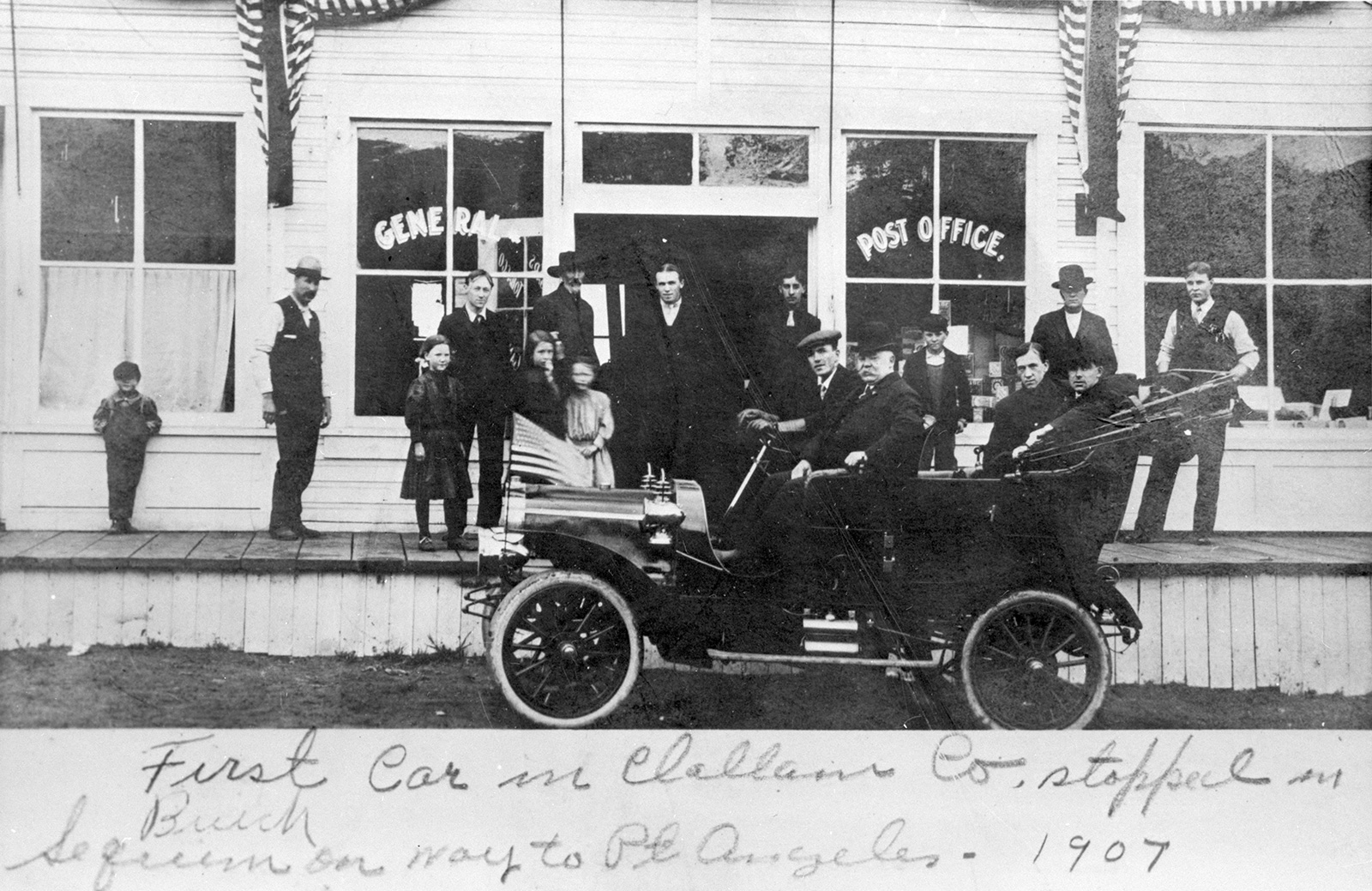 Photo from the North Olympic Heritage — Bert Kellogg Photograph Collection. Description reads: First car in Clallam County, 1906 Buick belonging to James “Jim” Herbert Gibson (9/1882-1/18/1947) parked in front of Jens Bugge’s store in Sequim in May, 1907. Yup, it’s the same car!