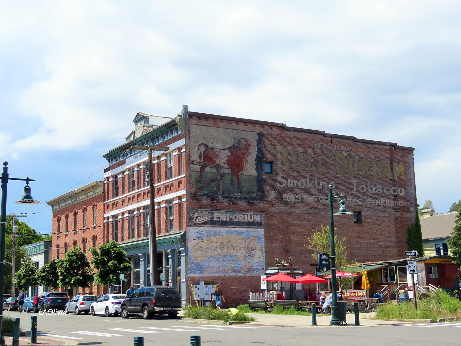 A one-handed snap of the Bull Durham “ghost mural” (a fading, painted sign at least 50 years old) on the Fred Lewis building, after convincing my friend to try a taste of Elevated Ice Cream‘s cardamom ice cream, and walking out with cones.