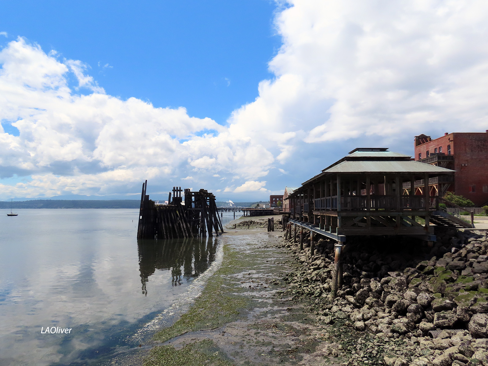 Looking down the low tide beaches of Jackson Tidal Park from the City Pier, with the old Quincy Street ferry dock on the left.