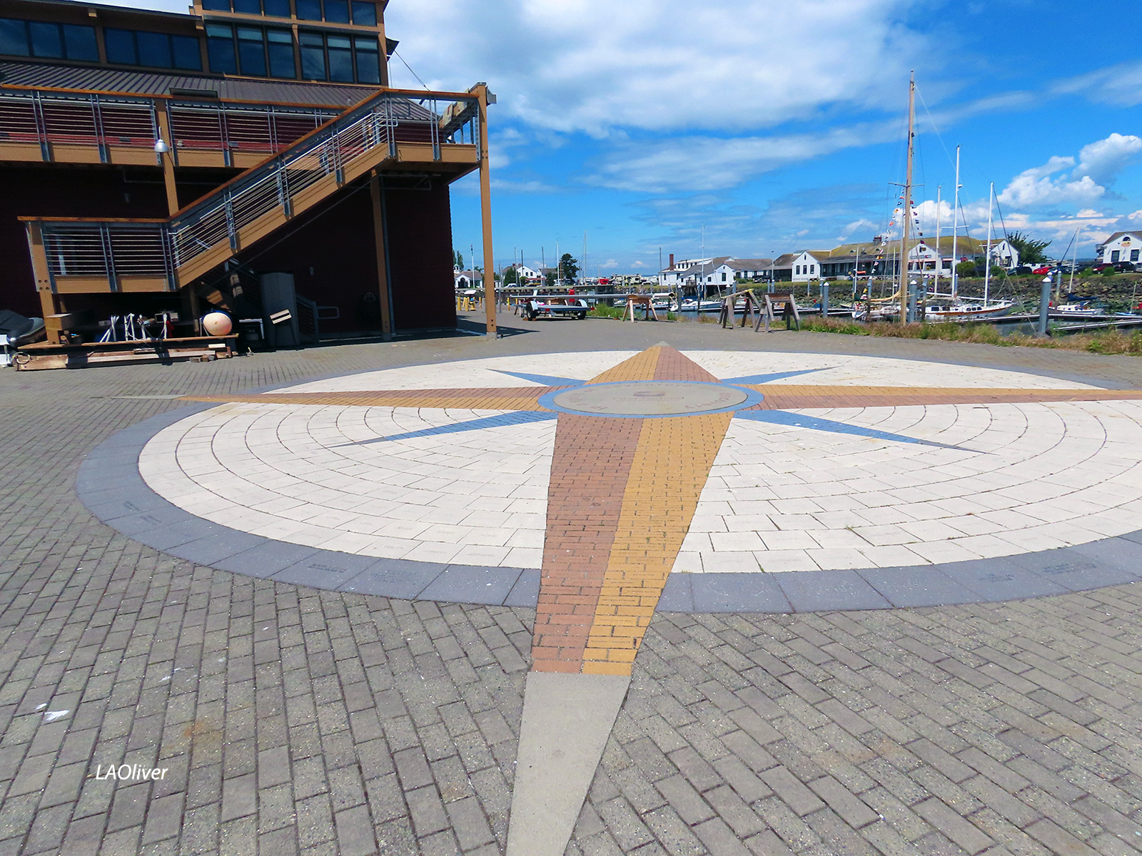The compass rose at the Northwest Maritime Center. The words in the center read “In a spirit of adventure and discovery.”