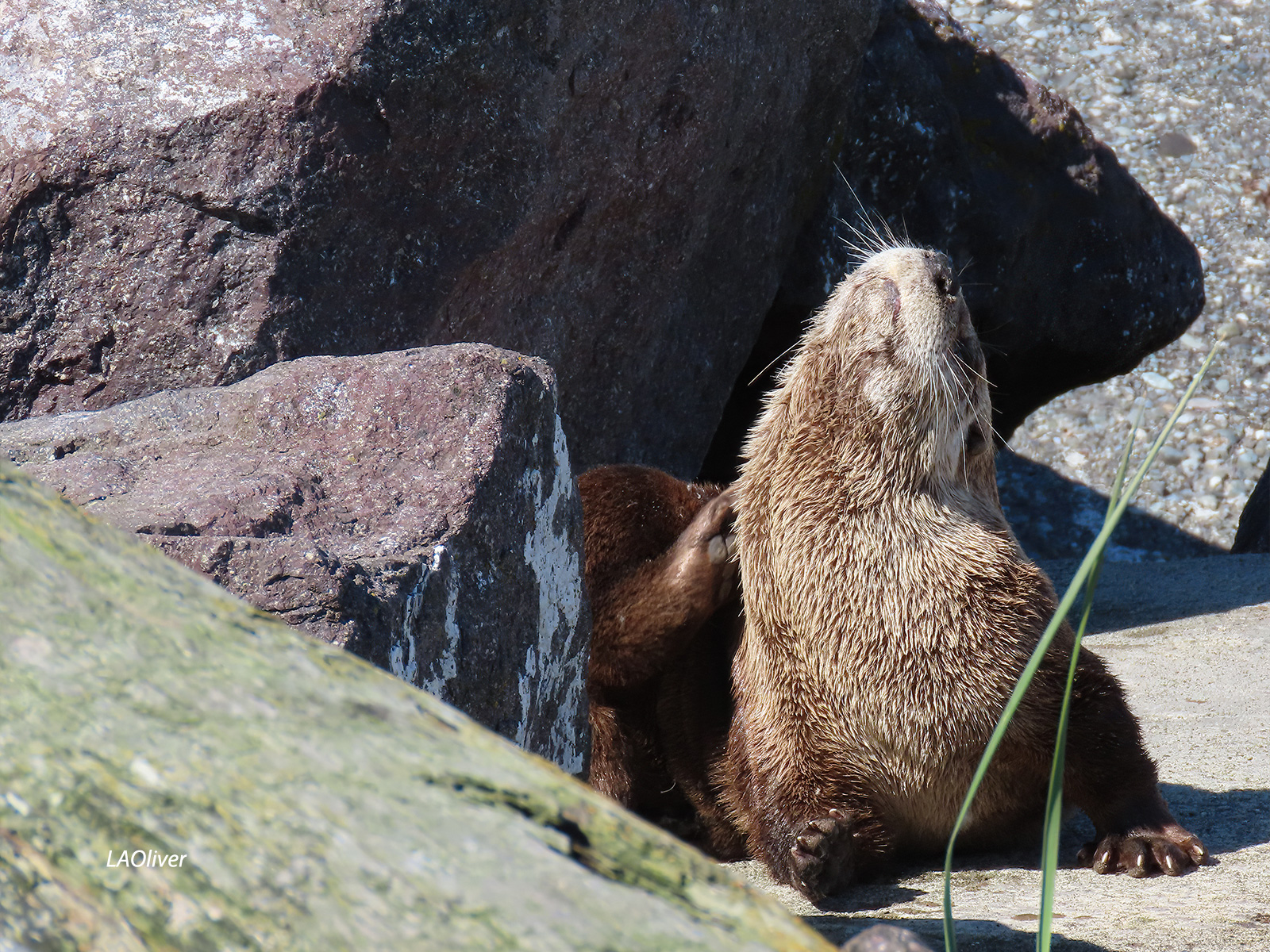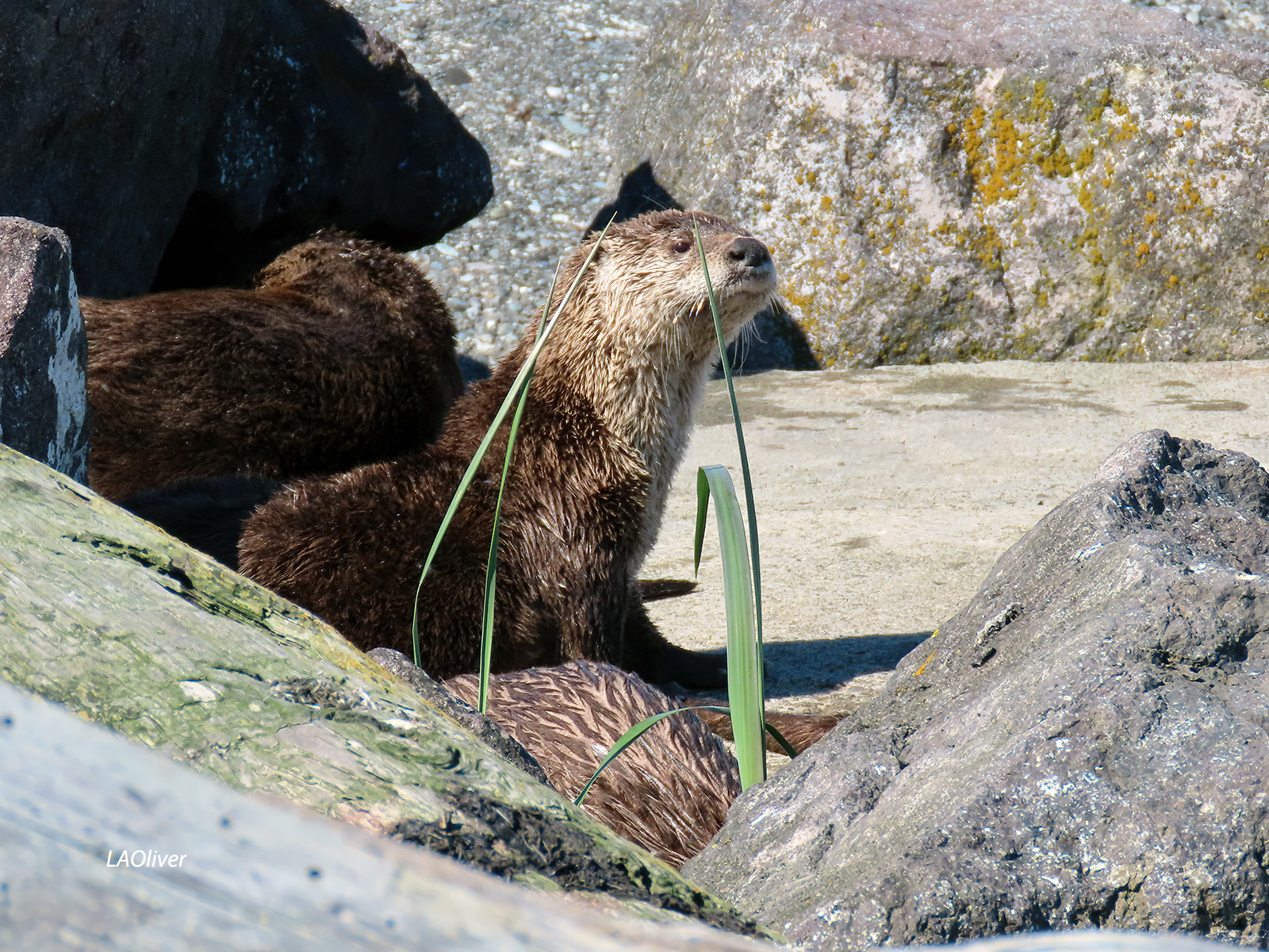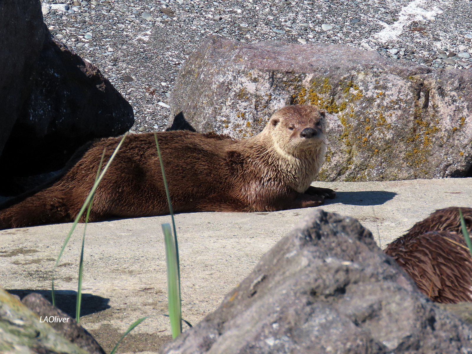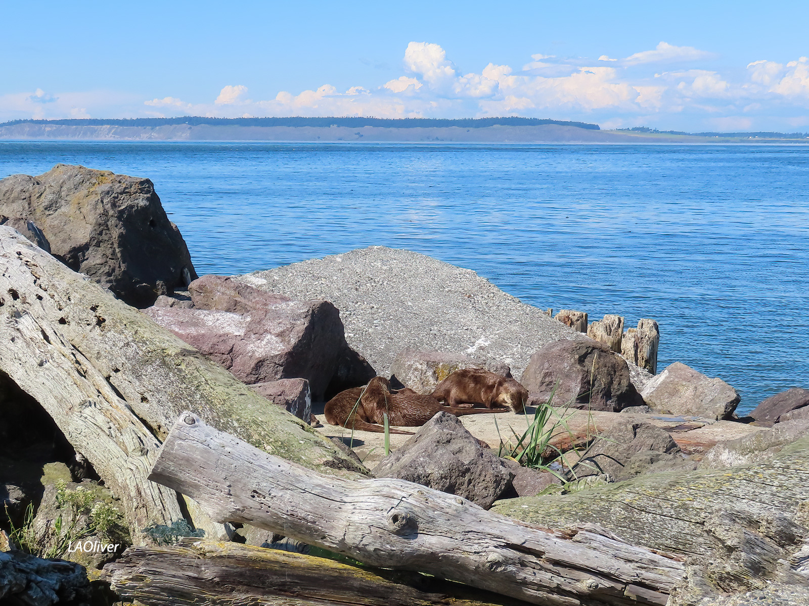 After lunch at Doc’s Marina Grill at Point Hudson (smoked salmon mac & cheese for her and the Thai curry mussels for me), we ended up at the Point Wilson Lighthouse. As we walked around the lighthouse and up and down a stretch of beach, we saw sea otters sunning themselves. Not even 20 feet from where we stood!