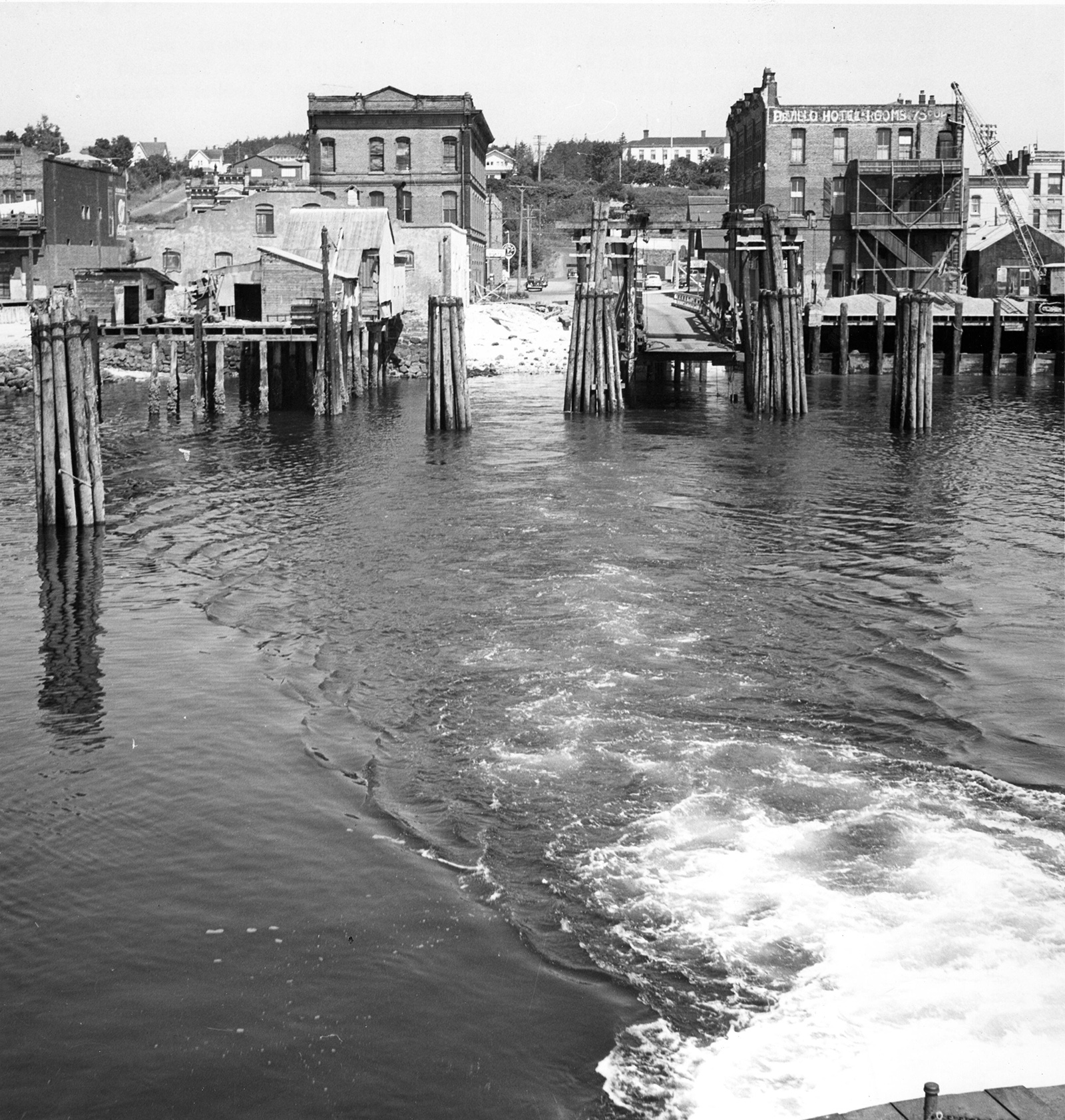 This photo, from the 1940s, is taken from the back of a departing ferry from the Quincy Street dock. Photo from the Washington State Digital Archives.