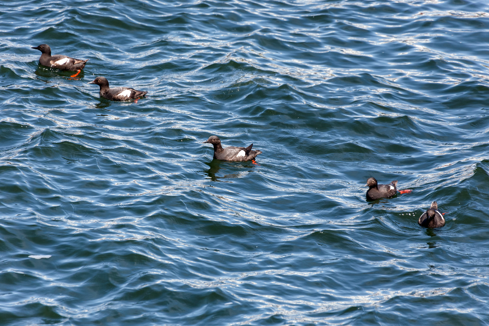Sporting bright red-orange legs, pigeon guillemots bobbing alongside the boat.